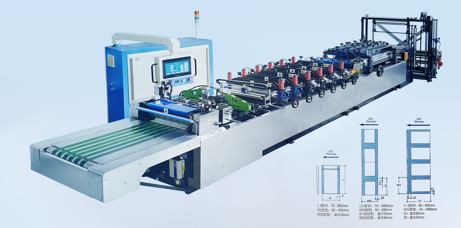 材料:各種復合薄膜。 卷筒:寬度≤1200mm,直徑≤500mm。 制袋速度:200段/分(機械設計速度)約<40m/min。 制袋寬度:≤500mm。 制袋長度:50-500mm,制袋長度超過500mm 以上應采用倍送功能。